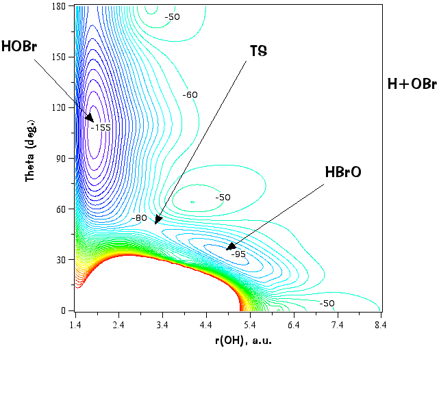 (2 internal coordinates + the potential energy). The figures below are for fixed r(BrO) = 3.34 a.u. Consider that to